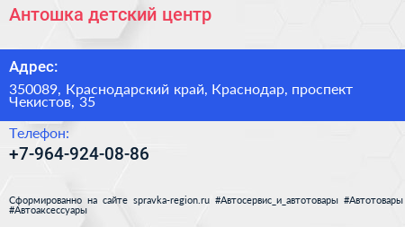 Антошка, детский центр по адресу 350089, Краснодарский край, Краснодар, проспект Чекистов, 35 в дальнейшем Организация, размещена в следующих категориях: