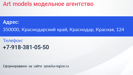 Art models, модельное агентство по адресу 350000, Краснодарский край, Краснодар, Красная, 124 в дальнейшем Организация, размещена в следующих категориях: