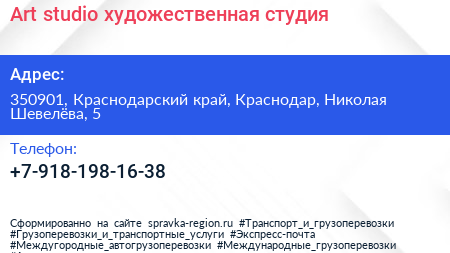 Art studio, художественная студия по адресу 350901, Краснодарский край, Краснодар, Николая Шевелёва, 5 в дальнейшем Организация, размещена в следующих категориях: