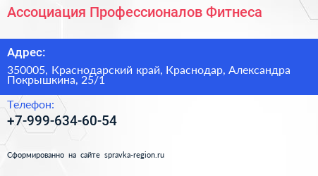 Ассоциация Профессионалов Фитнеса по адресу 350005, Краснодарский край, Краснодар, Александра Покрышкина, 25/1 в дальнейшем Организация, размещена в следующих категориях: