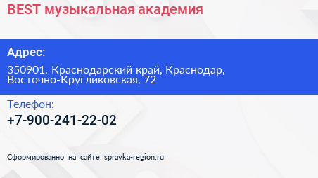 BEST, музыкальная академия по адресу 350901, Краснодарский край, Краснодар, Восточно-Кругликовская, 72 в дальнейшем Организация, размещена в следующих категориях: