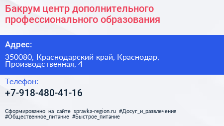 Бакрум, центр дополнительного профессионального образования по адресу 350080, Краснодарский край, Краснодар, Производственная, 4 в дальнейшем Организация, размещена в следующих категориях: