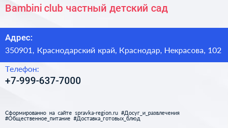 Bambini-club, частный детский сад по адресу 350901, Краснодарский край, Краснодар, Некрасова, 102 в дальнейшем Организация, размещена в следующих категориях: