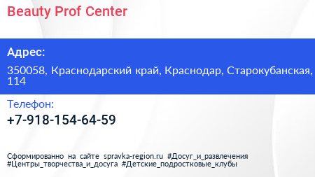 Beauty Prof Center по адресу 350058, Краснодарский край, Краснодар, Старокубанская, 114 в дальнейшем Организация, размещена в следующих категориях: