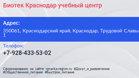 Биотек Краснодар, учебный центр по адресу 350061, Краснодарский край, Краснодар, Трудовой Славы, 1 в дальнейшем Организация, размещена в следующих категориях: