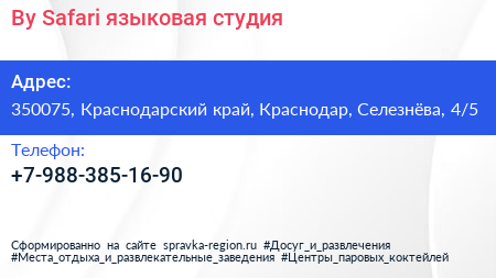 By Safari, языковая студия по адресу 350075, Краснодарский край, Краснодар, Селезнёва, 4/5 в дальнейшем Организация, размещена в следующих категориях: