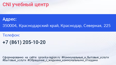 CNI, учебный центр по адресу 350004, Краснодарский край, Краснодар, Северная, 225 в дальнейшем Организация, размещена в следующих категориях: