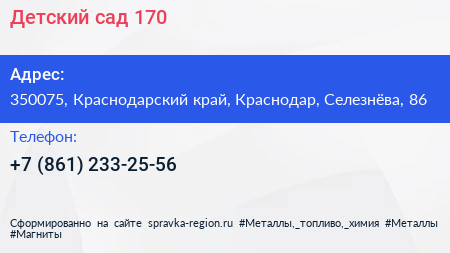 Детский сад №170 по адресу 350075, Краснодарский край, Краснодар, Селезнёва, 86 в дальнейшем Организация, размещена в следующих категориях: