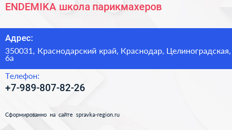 ENDEMIKA, школа парикмахеров по адресу 350031, Краснодарский край, Краснодар, Целиноградская, 6а в дальнейшем Организация, размещена в следующих категориях: