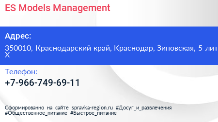 ES Models Management по адресу 350010, Краснодарский край, Краснодар, Зиповская, 5 лит Х в дальнейшем Организация, размещена в следующих категориях: