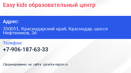 Easy kids, образовательный центр по адресу 350051, Краснодарский край, Краснодар, шоссе Нефтяников, 36 в дальнейшем Организация, размещена в следующих категориях: