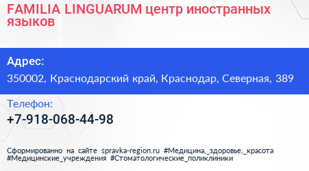 FAMILIA LINGUARUM, центр иностранных языков по адресу 350002, Краснодарский край, Краснодар, Северная, 389 в дальнейшем Организация, размещена в следующих категориях: