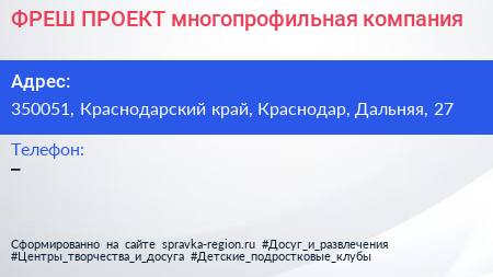 ФРЕШ-ПРОЕКТ, многопрофильная компания по адресу 350051, Краснодарский край, Краснодар, Дальняя, 27 в дальнейшем Организация, размещена в следующих категориях: