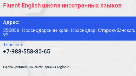 Fluent English, школа иностранных языков по адресу 350058, Краснодарский край, Краснодар, Старокубанская, 92 в дальнейшем Организация, размещена в следующих категориях: