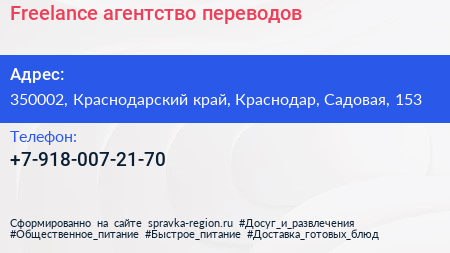 Freelance, агентство переводов по адресу 350002, Краснодарский край, Краснодар, Садовая, 153 в дальнейшем Организация, размещена в следующих категориях: