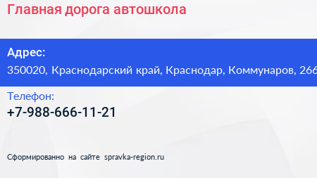 Главная дорога, автошкола по адресу 350020, Краснодарский край, Краснодар, Коммунаров, 266 в дальнейшем Организация, размещена в следующих категориях: