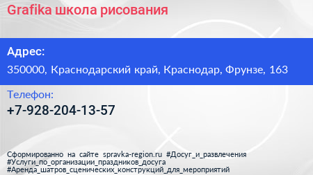 Grafika, школа рисования по адресу 350000, Краснодарский край, Краснодар, Фрунзе, 163 в дальнейшем Организация, размещена в следующих категориях: