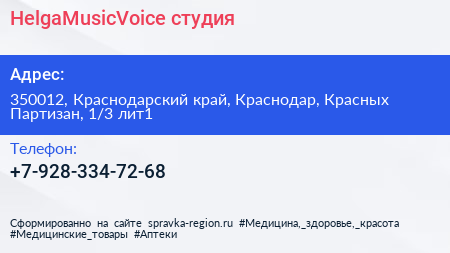 HelgaMusicVoice, студия по адресу 350012, Краснодарский край, Краснодар, Красных Партизан, 1/3 лит1 в дальнейшем Организация, размещена в следующих категориях: