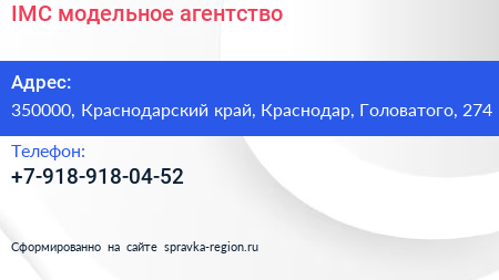 IMC, модельное агентство по адресу 350000, Краснодарский край, Краснодар, Головатого, 274 в дальнейшем Организация, размещена в следующих категориях: