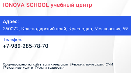 IONOVA SCHOOL, учебный центр по адресу 350072, Краснодарский край, Краснодар, Московская, 59 в дальнейшем Организация, размещена в следующих категориях: