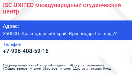 ISC-UNITED, международный студенческий центр по адресу 350000, Краснодарский край, Краснодар, Гоголя, 74 в дальнейшем Организация, размещена в следующих категориях: