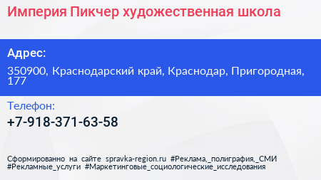 Империя Пикчер, художественная школа по адресу 350900, Краснодарский край, Краснодар, Пригородная, 177 в дальнейшем Организация, размещена в следующих категориях: