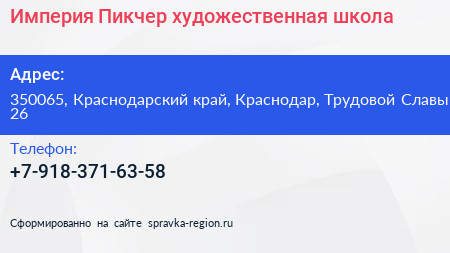 Империя Пикчер, художественная школа по адресу 350065, Краснодарский край, Краснодар, Трудовой Славы, 26 в дальнейшем Организация, размещена в следующих категориях: