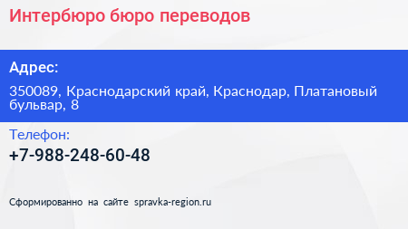 Интербюро, бюро переводов по адресу 350089, Краснодарский край, Краснодар, Платановый бульвар, 8 в дальнейшем Организация, размещена в следующих категориях: