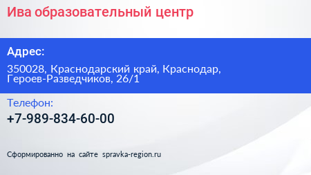 Ива, образовательный центр по адресу 350028, Краснодарский край, Краснодар, Героев-Разведчиков, 26/1 в дальнейшем Организация, размещена в следующих категориях: