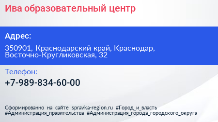 Ива, образовательный центр по адресу 350901, Краснодарский край, Краснодар, Восточно-Кругликовская, 32 в дальнейшем Организация, размещена в следующих категориях: