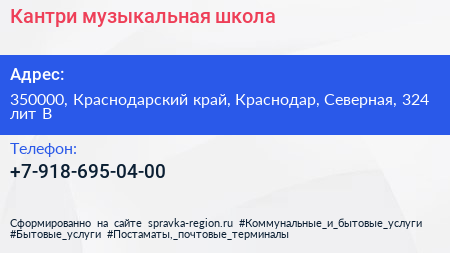 Кантри, музыкальная школа по адресу 350000, Краснодарский край, Краснодар, Северная, 324 лит В в дальнейшем Организация, размещена в следующих категориях: