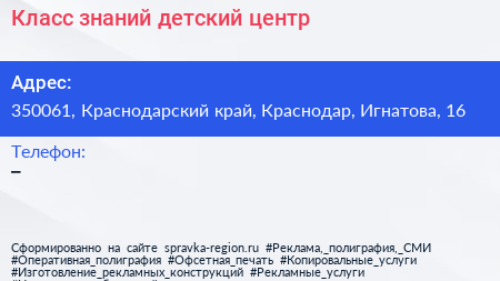 Класс знаний, детский центр по адресу 350061, Краснодарский край, Краснодар, Игнатова, 16 в дальнейшем Организация, размещена в следующих категориях:
