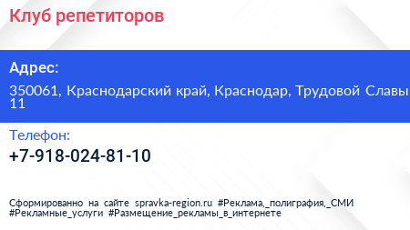 Клуб репетиторов по адресу 350061, Краснодарский край, Краснодар, Трудовой Славы, 11 в дальнейшем Организация, размещена в следующих категориях: