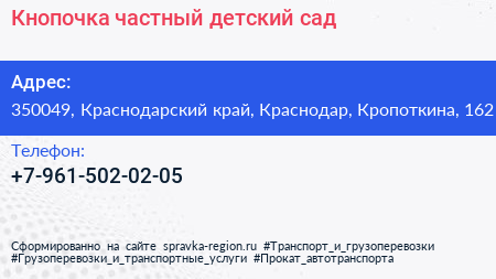 Кнопочка, частный детский сад по адресу 350049, Краснодарский край, Краснодар, Кропоткина, 162 в дальнейшем Организация, размещена в следующих категориях: