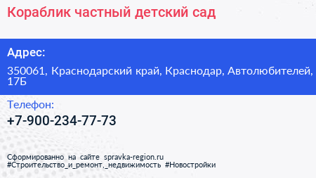 Кораблик, частный детский сад по адресу 350061, Краснодарский край, Краснодар, Автолюбителей, 17Б в дальнейшем Организация, размещена в следующих категориях: