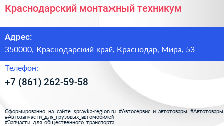 Краснодарский монтажный техникум по адресу 350000, Краснодарский край, Краснодар, Мира, 53 в дальнейшем Организация, размещена в следующих категориях: