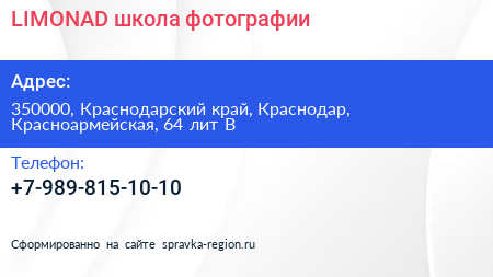 LIMONAD, школа фотографии по адресу 350000, Краснодарский край, Краснодар, Красноармейская, 64 лит В в дальнейшем Организация, размещена в следующих категориях: