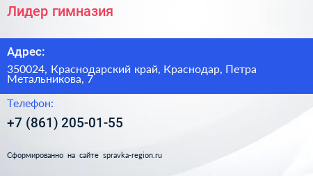 Лидер, гимназия по адресу 350024, Краснодарский край, Краснодар, Петра Метальникова, 7 в дальнейшем Организация, размещена в следующих категориях: