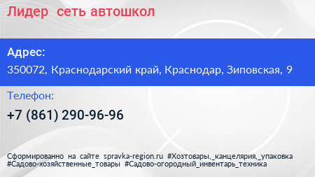 Лидер+, сеть автошкол по адресу 350072, Краснодарский край, Краснодар, Зиповская, 9 в дальнейшем Организация, размещена в следующих категориях: