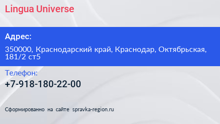 Lingua Universe по адресу 350000, Краснодарский край, Краснодар, Октябрьская, 181/2 ст5 в дальнейшем Организация, размещена в следующих категориях: