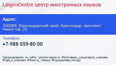 LingvoCentre, центр иностранных языков по адресу 350089, Краснодарский край, Краснодар, проспект Чекистов, 22 в дальнейшем Организация, размещена в следующих категориях: