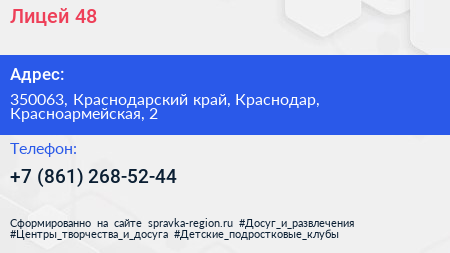 Лицей №48 по адресу 350063, Краснодарский край, Краснодар, Красноармейская, 2 в дальнейшем Организация, размещена в следующих категориях:
