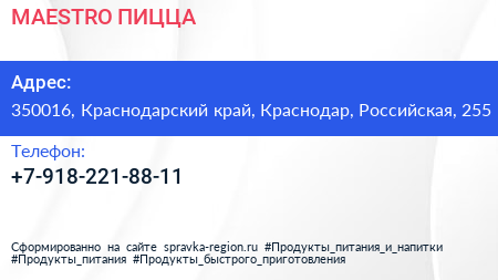 MAESTRO ПИЦЦА по адресу 350016, Краснодарский край, Краснодар, Российская, 255 в дальнейшем Организация, размещена в следующих категориях: