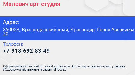 Малевич, арт-студия по адресу 350028, Краснодарский край, Краснодар, Героя Аверкиева, 20 в дальнейшем Организация, размещена в следующих категориях: