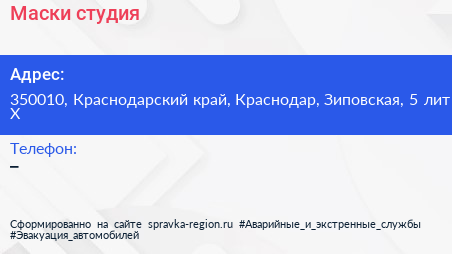 Маски, студия по адресу 350010, Краснодарский край, Краснодар, Зиповская, 5 лит Х в дальнейшем Организация, размещена в следующих категориях: