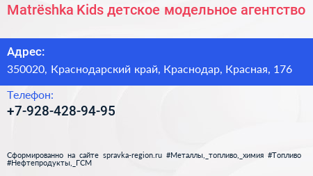 Matrёshka Kids, детское модельное агентство по адресу 350020, Краснодарский край, Краснодар, Красная, 176 в дальнейшем Организация, размещена в следующих категориях: