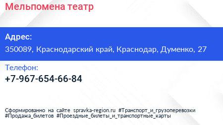 Мельпомена, театр по адресу 350089, Краснодарский край, Краснодар, Думенко, 27 в дальнейшем Организация, размещена в следующих категориях: