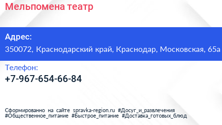 Мельпомена, театр по адресу 350072, Краснодарский край, Краснодар, Московская, 65а в дальнейшем Организация, размещена в следующих категориях: