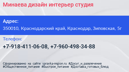 Минаева-дизайн, интерьер-студия по адресу 350010, Краснодарский край, Краснодар, Зиповская, 5г в дальнейшем Организация, размещена в следующих категориях: