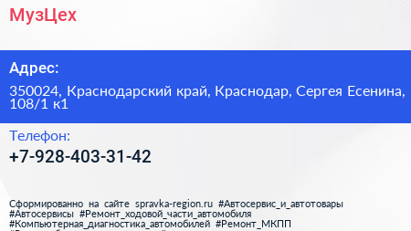 МузЦех по адресу 350024, Краснодарский край, Краснодар, Сергея Есенина, 108/1 к1 в дальнейшем Организация, размещена в следующих категориях: